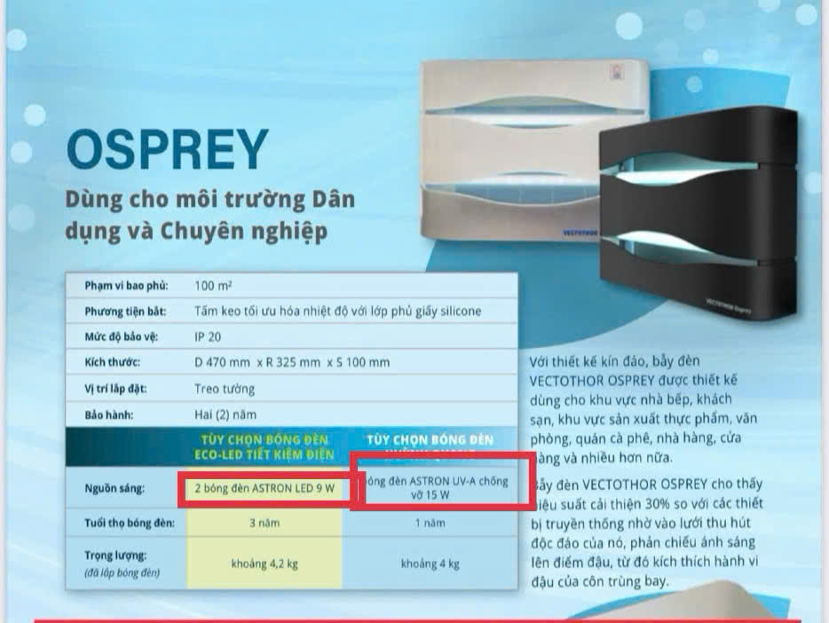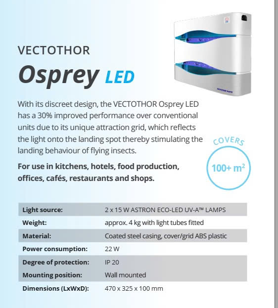 - Đèn diệt côn trùng Vectothor Osprey, nhờ vào ánh sáng với bước sóng tia UV ở mức 350nm-400nm. Thu hút côn trùng từ xa bay tới tiêu diệt côn trùng bằng Tấm keo dính. Chắc chắn sẽ tạo cho khu vực xung quanh không còn bóng dáng của côn trùng ảnh hưởng đến Sức Khỏe và Công việc của Bạn.